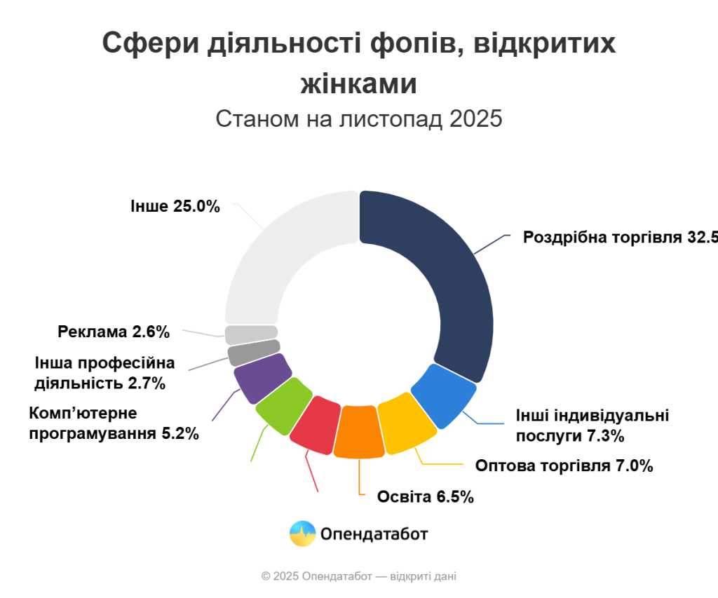 За сферами діяльності кожен третій новий жіночий бізнес відкривається у роздрібній торгівлі (49,7 тис.). Також популярні індивідуальні послуги (11,1 тис.), оптова торгівля (10,7 тис.), освіта (10 тис.) та харчування (8,8 тис.).