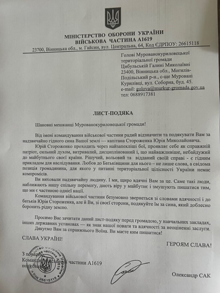 Мурованокуриловецька селищна рада вдруге отримала лист-подяку від командування одного з бойових підрозділів Збройних Сил України за сумлінну службу мешканця селища Юрія Стороженка. Про…