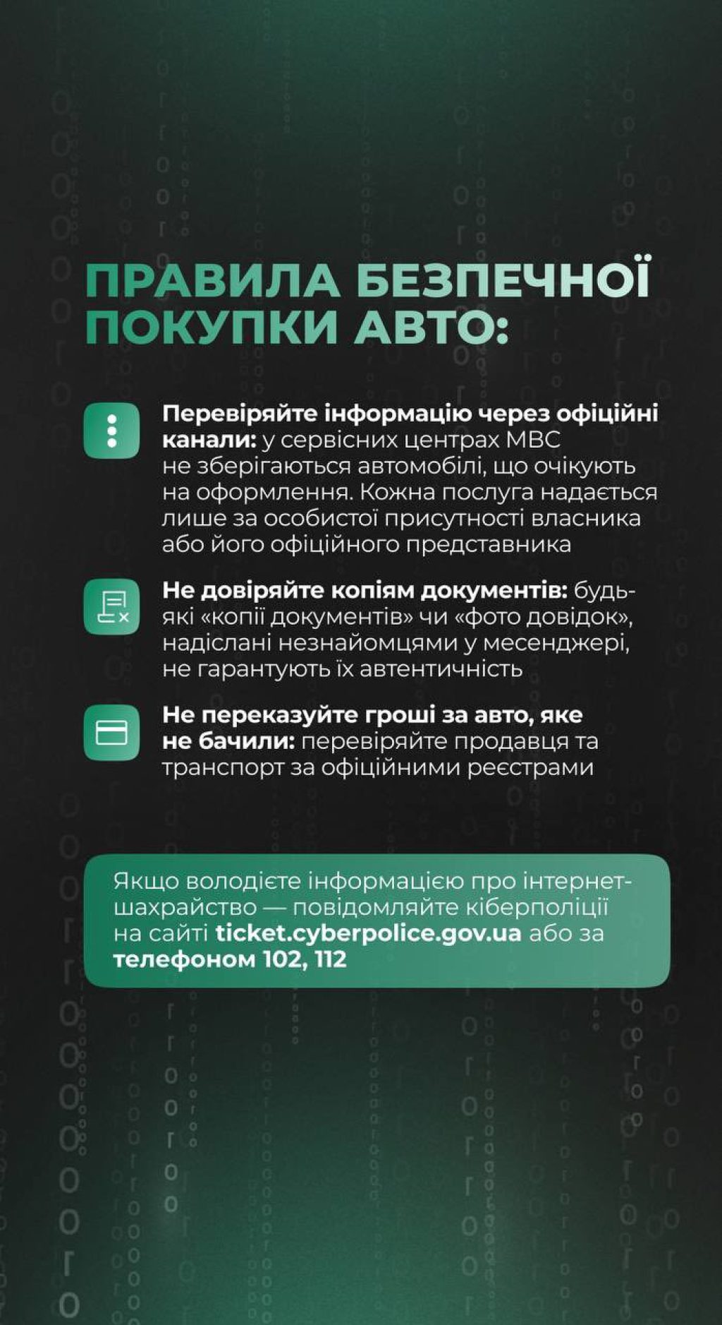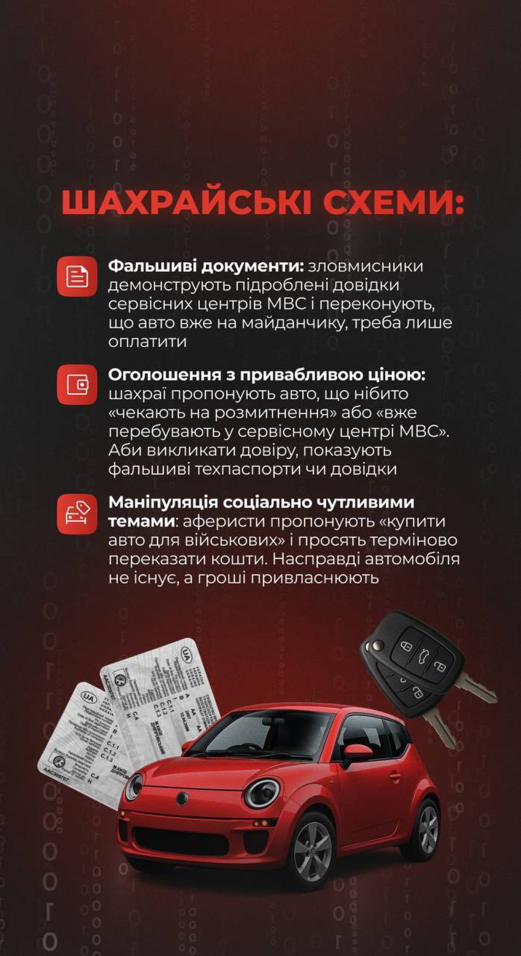 Кіберполіція України та Головний сервісний центр МВС застерігають громадян від нових шахрайських схем, пов’язаних із продажем автомобілів онлайн.
