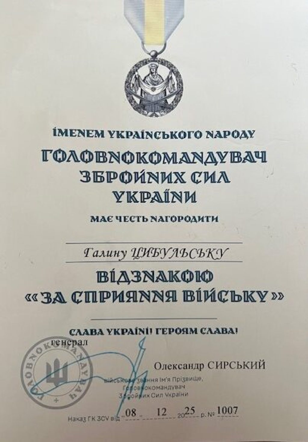 Органи місцевого самоврядування та громада вітають Галину Цибульську з високим визнанням її діяльності та подякою військових за вагомий внесок у підтримку армії.