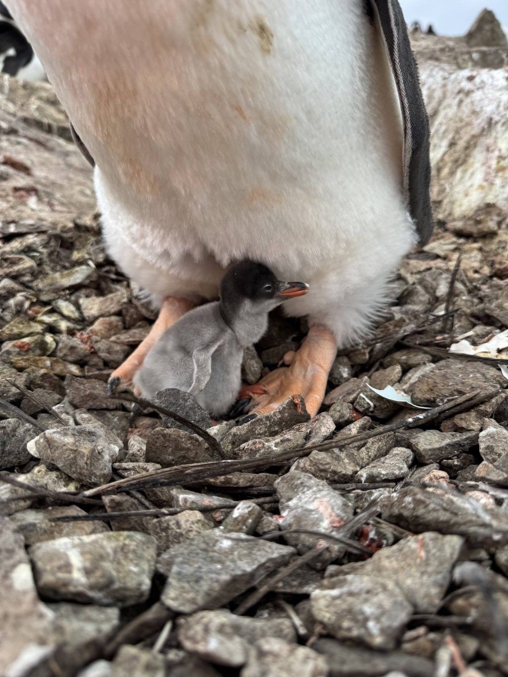 Біологи нагадують, що субантарктичні пінгвінята вилуплюються асинхронно — у тому порядку, в якому були відкладені яйця. Спершу вони вкриті сірим пухом, який поступово темнішає та густішає. Приблизно за місяць після народження маленькі пінгвіни починають линяти й змінювати пух на пір’я.