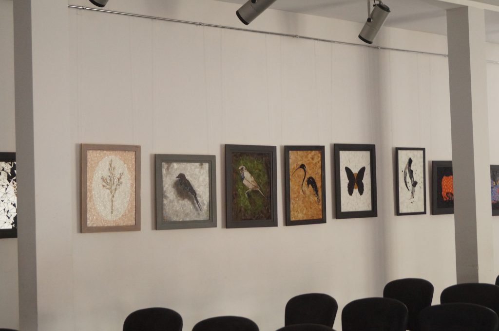 «Тут ми представляємо наш проєкт, над яким ми працювали понад рік. Це проєкти і наших майстрів, які з нами працюють. … У нас склався такий колектив, що ми працюємо в дуже різних напрямках. Це і абстракція, і, як бачите, примітивізм – омаж на роботи Марії Примаченко – і мініатюрні пташки, де задача була передати тонкощі кольору». Художник наголосив, що виставка покликана змінити уявлення про мозаїку як щось громіздке й старовинне: