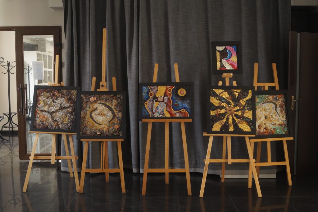 «Тут ми представляємо наш проєкт, над яким ми працювали понад рік. Це проєкти і наших майстрів, які з нами працюють. … У нас склався такий колектив, що ми працюємо в дуже різних напрямках. Це і абстракція, і, як бачите, примітивізм – омаж на роботи Марії Примаченко – і мініатюрні пташки, де задача була передати тонкощі кольору». Художник наголосив, що виставка покликана змінити уявлення про мозаїку як щось громіздке й старовинне: