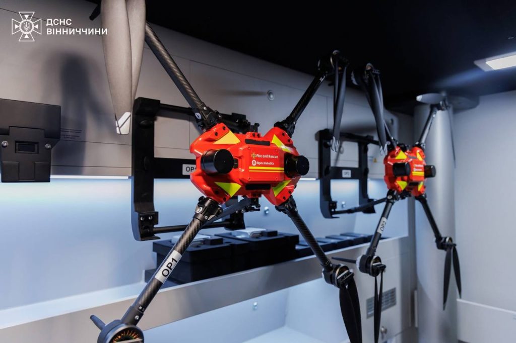 До комплекту входить інноваційний робот пожежогасіння, призначений для виконання завдань у зонах підвищеного ризику — місцях прильотів, можливих повторних обстрілів або серед завалів. Також комплекс оснащено двома літальними безпілотниками, що дозволяють проводити повітряну розвідку, оцінювати масштаби руйнувань і координувати дії підрозділів у режимі реального часу.