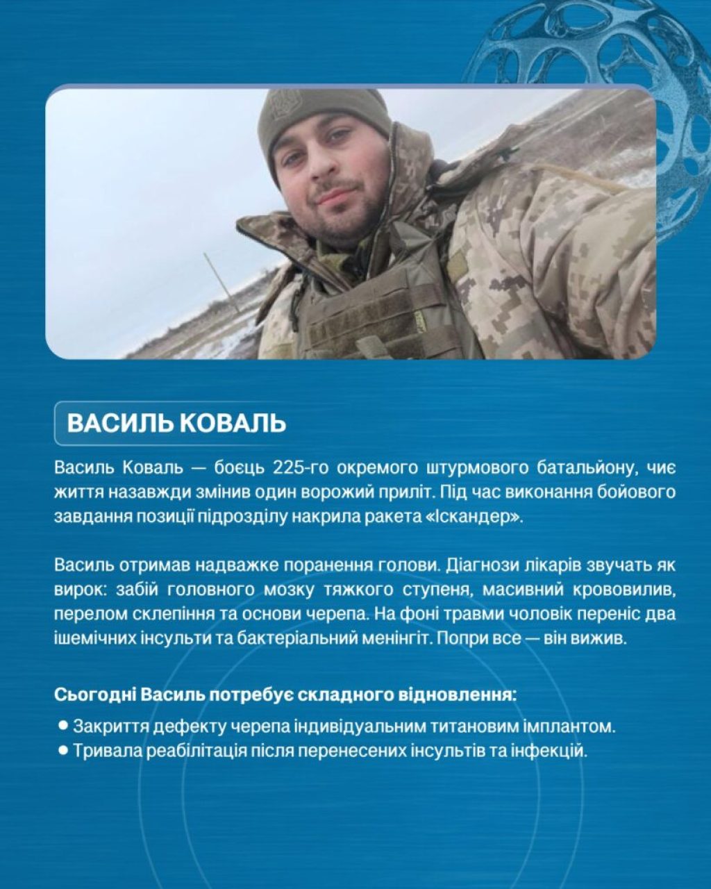 Для подальшого відновлення бійцю необхідна операція зі встановлення індивідуального титанового імпланта, а також тривала реабілітація після перенесених ускладнень.